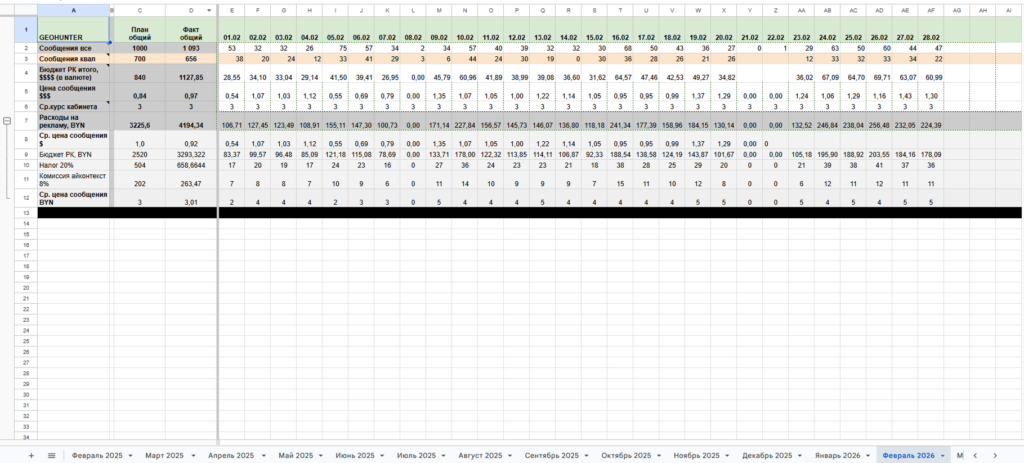 Мы фиксируем каждый показатель рекламы: замеряем цену за 1000 показов, замеряем конверсию в клик по рекламе, замеряем конверсию из клика в лид, замеряем сколько было всего лидов, сколько из них квалифицированных, сколько из них дошли до производства, сколько из них заключили договор.
